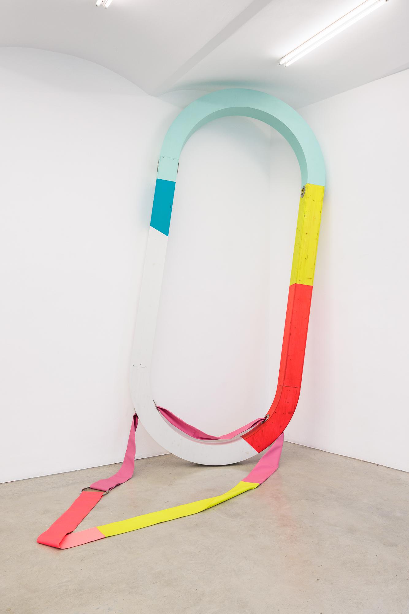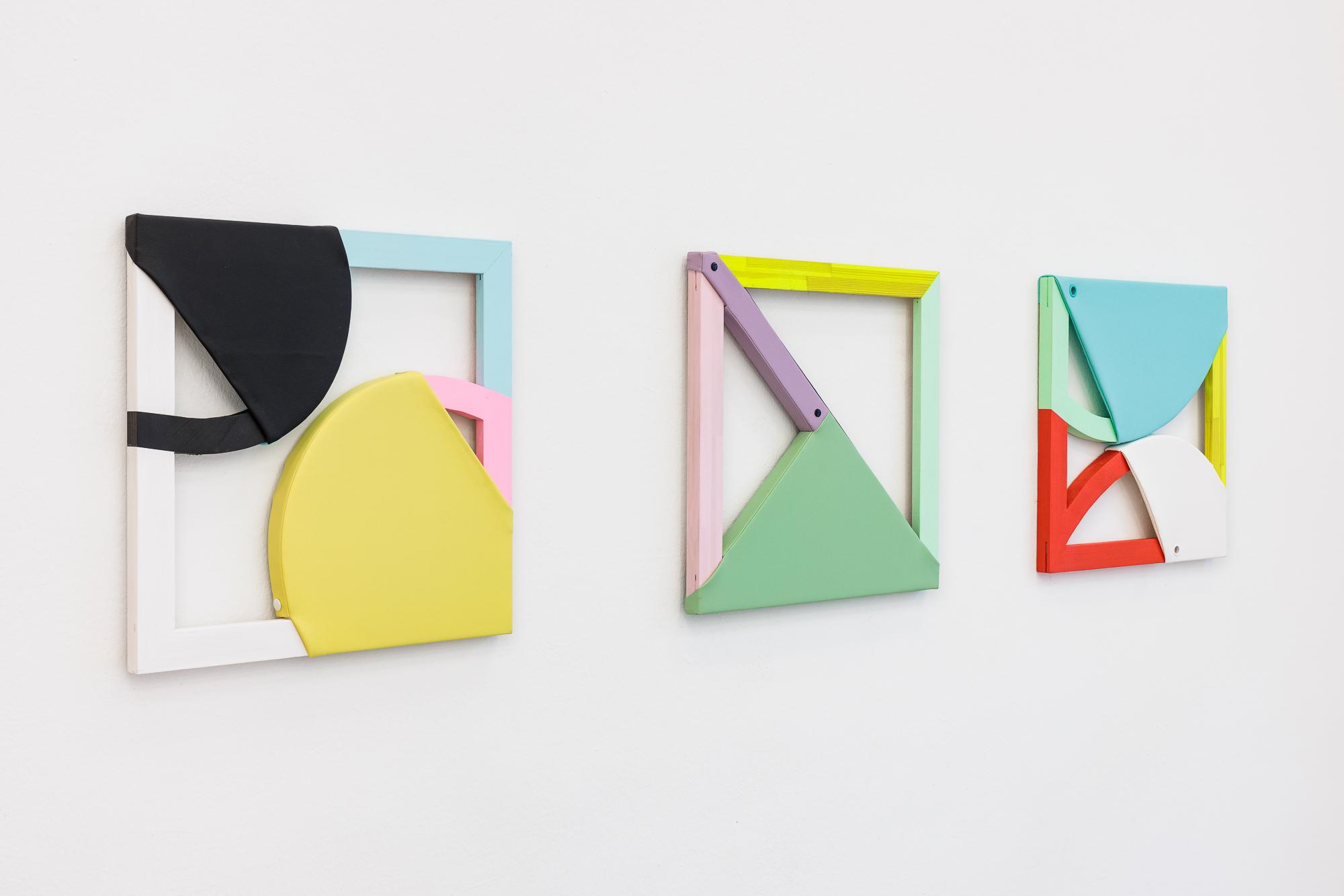 In the works of the Austrian artists Gabriele FULTERER and Christine SCHERRER, who have worked together as a duo since 2007, wooden image carriers meet artificial leather. With the aid of grommets, FULTERER SCHERRER bind up and encase square or oval stretcher frames, and stretch straps and surfaces across the otherwise empty spaces. The bright colouration from neon yellow to pastel pink is in contrast to the associations of artificial leather with fetishization and sadomasochism. The titles of the works point to suffering (“Pills”) and play with double meanings: the word “Studs” stands for rivets and plugs of all kinds, yet also stands for sexual athletes. In this manner FULTERER SCHERRER address, as they say, “questions of dominance, loss of control, and pain.”