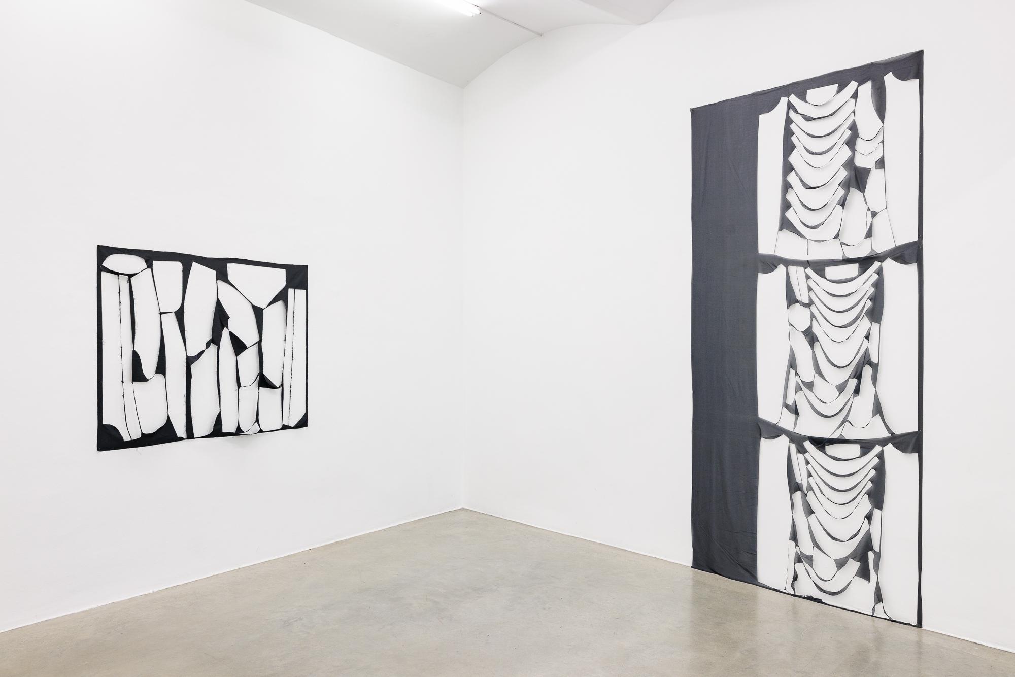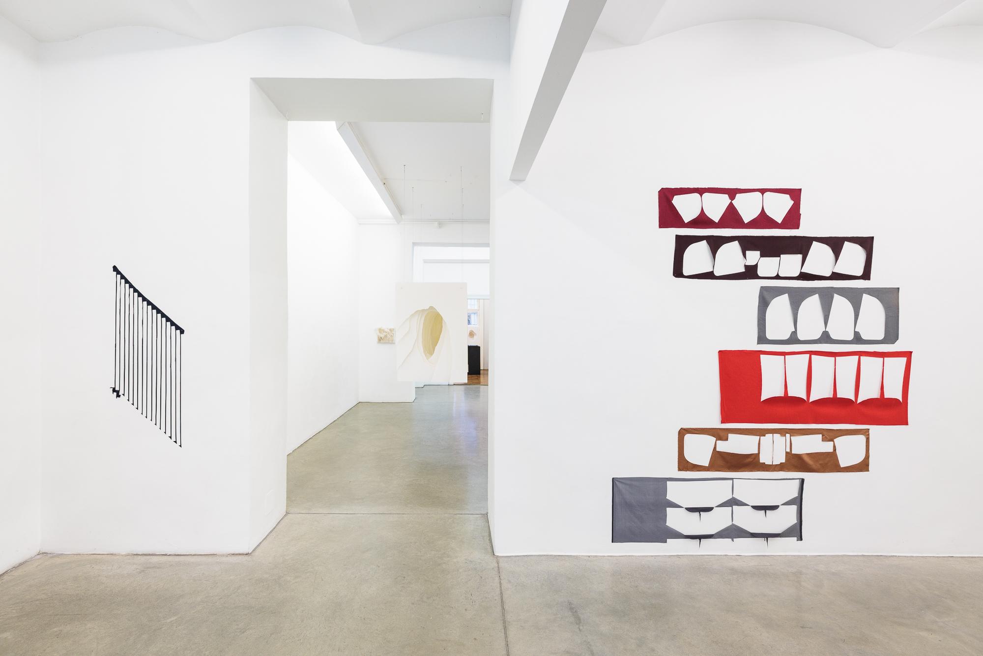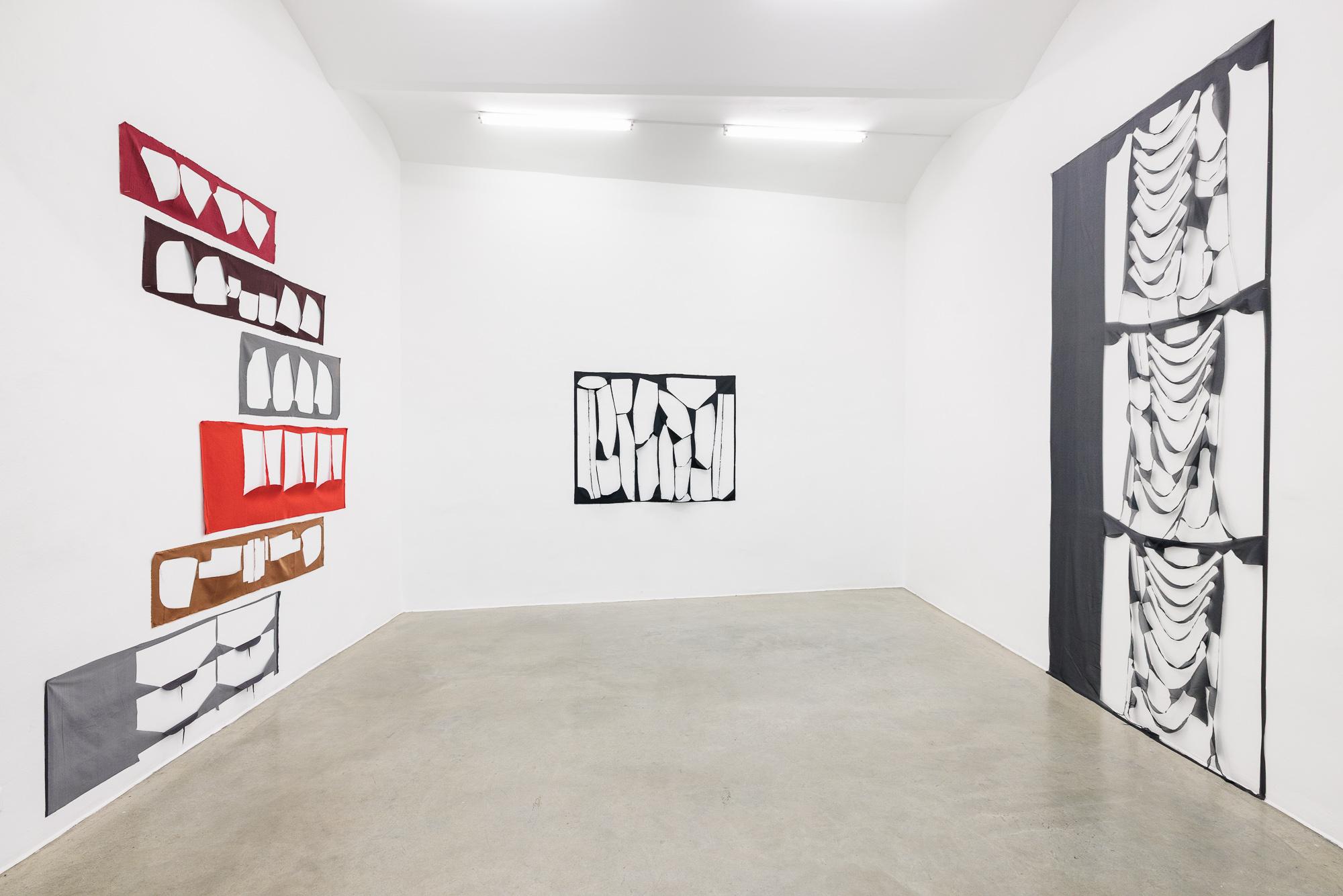Bei Marion BARUCH rücken die Leerstellen ins Zentrum. Die Künstlerin, 1929 im rumänischen Timişoara geboren und heute in der Lombardei ansässig, verwendet Überbleibsel aus der Modeindustrie: Reste, die nach dem Ausschneiden der Stoffteile übrig bleiben. In ihren Wandarbeiten offenbart sie die Schönheit dieser Zufallskompositionen. BARUCH legt Lesarten jenseits des Abstrakten nahe: In einer Reihe sich verjüngender Stoffstreifen erkennt sie eine Windharfe („Arpa eolica“), in drei Rechtecken die Aufnahmen aus einer Fotobox („Monument au photomaton“). Martin Herbert schrieb darüber: „Like Rorschach blots or clouds they create spaces […] for the viewer to wander and dream in: an emptiness that feels full of potential.“
