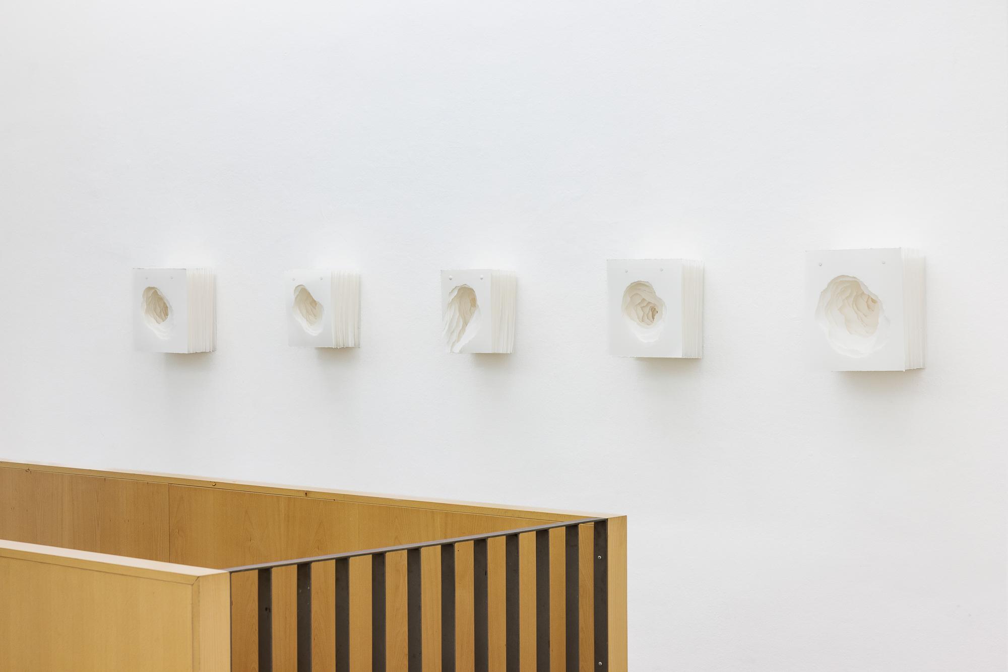 Bei Angela GLAJCAR (geb. 1970 in Mainz) fressen sich Leerstellen durch Papierstapel und verleihen ihnen dadurch Skulpturalität. Für ihre „Terforationen“ reißt die Künstlerin Löcher in Papierbögen; diese schichtet sie so übereinander, dass daraus Gebilde entstehen, die an Höhlen, Höhenschichten oder Gesteinsformationen erinnern. Durch das Reißen mit der Hand legt die Künstlerin die Struktur des Papiers offen, erzielt aber auch eine organische Wirkung. In Installationen wie 2009-069 Terforation vereint sich dabei das Monumentale mit dem Leichten. So gewinnt GLAJCAR dem scheinbar so neutralen Material Papier völlig neue Facetten ab.