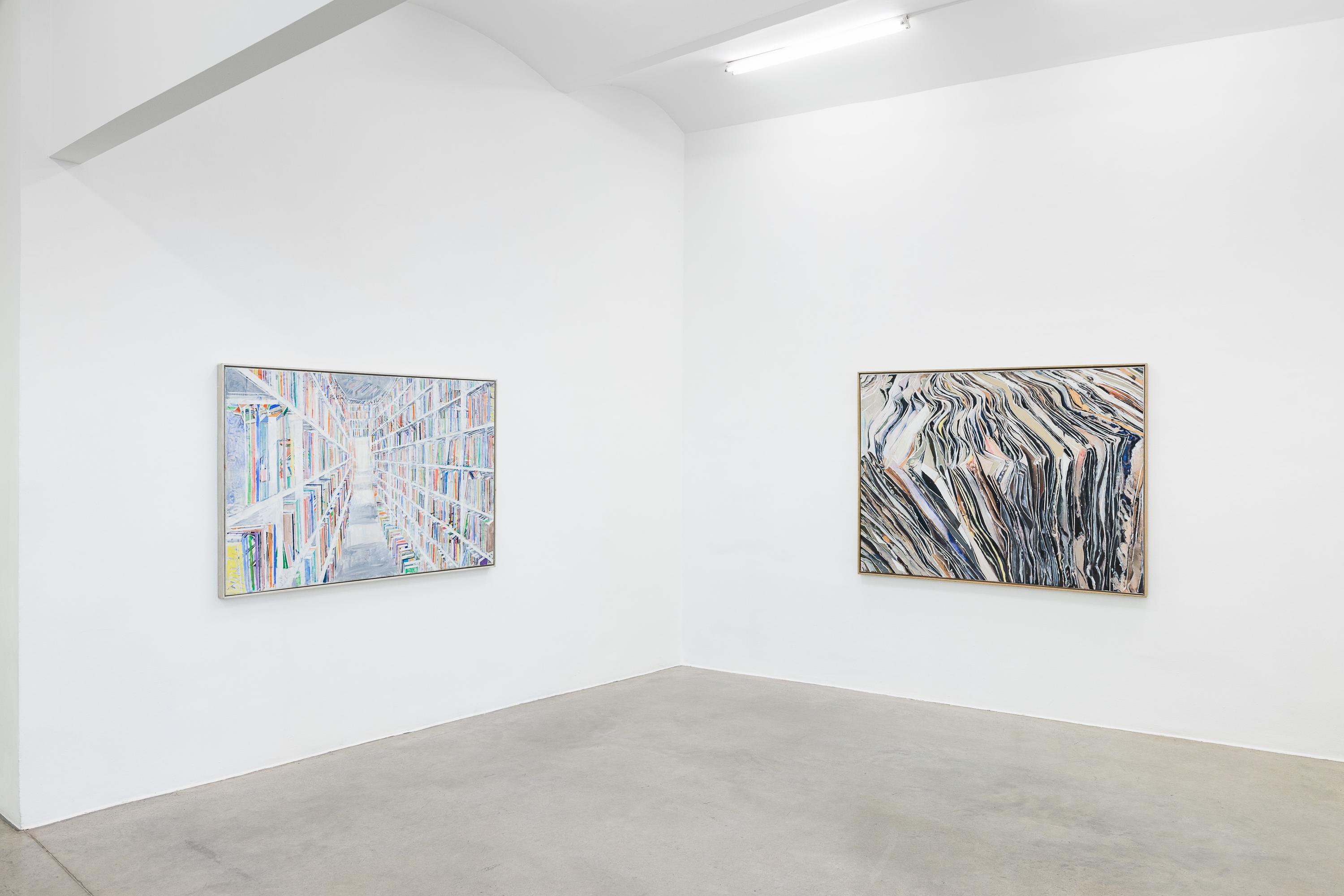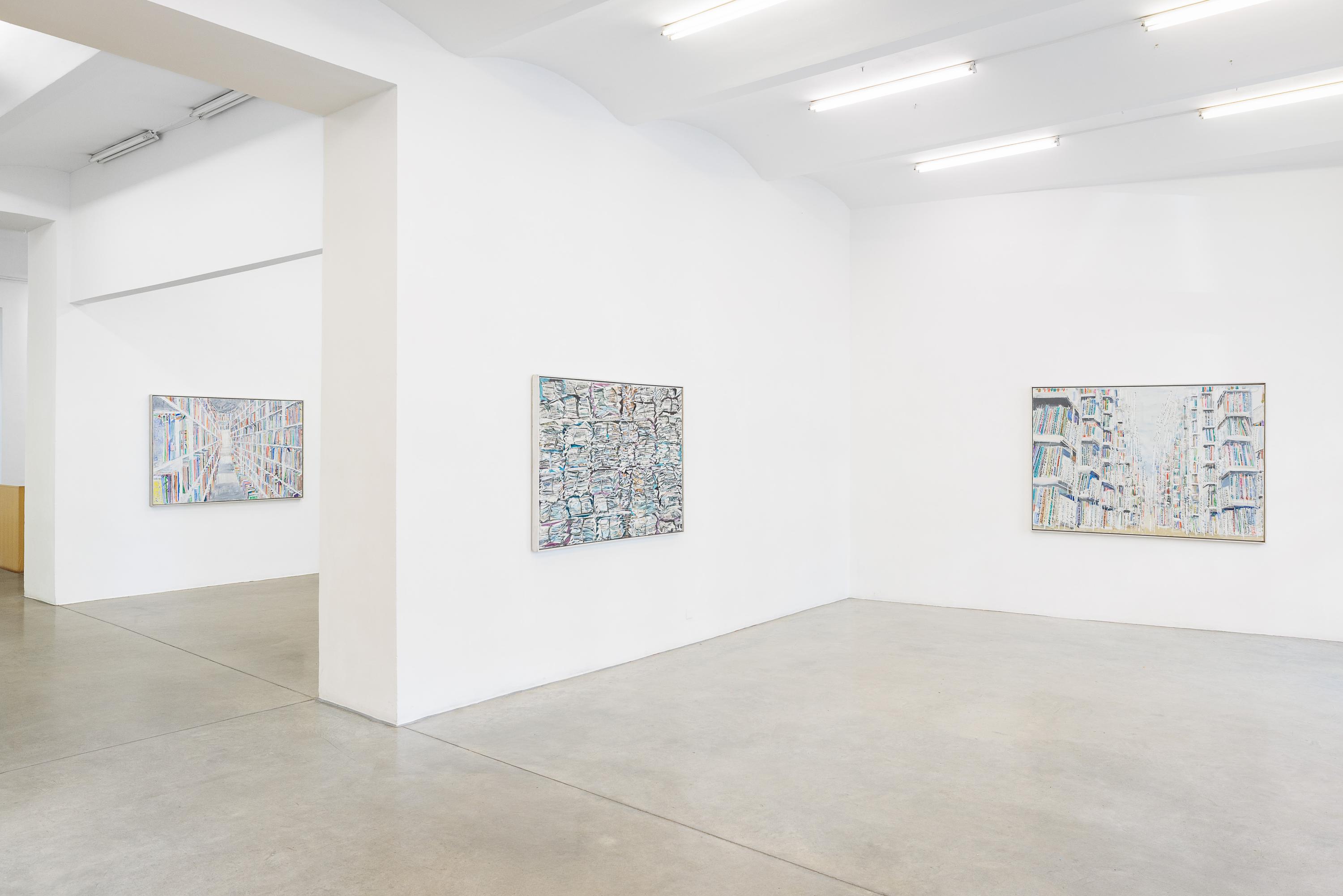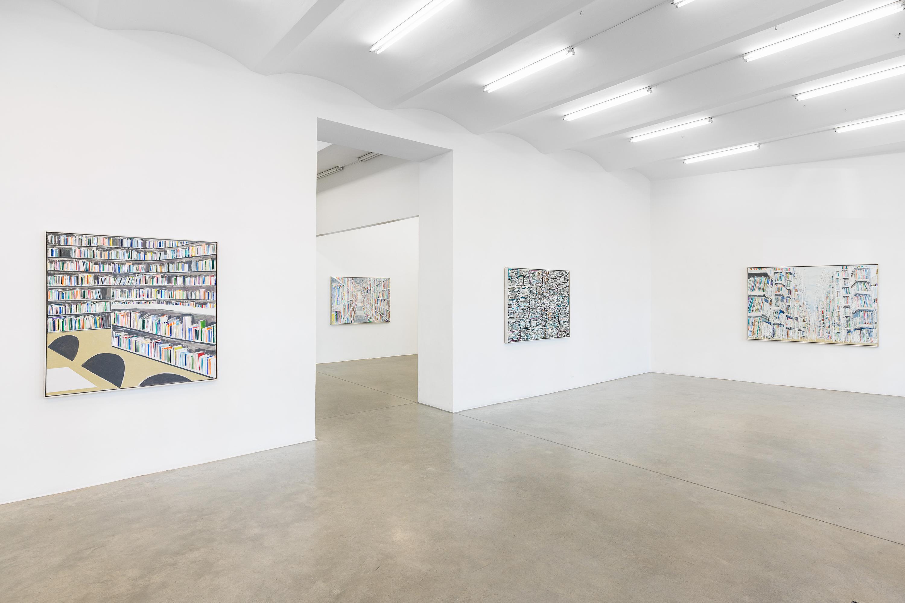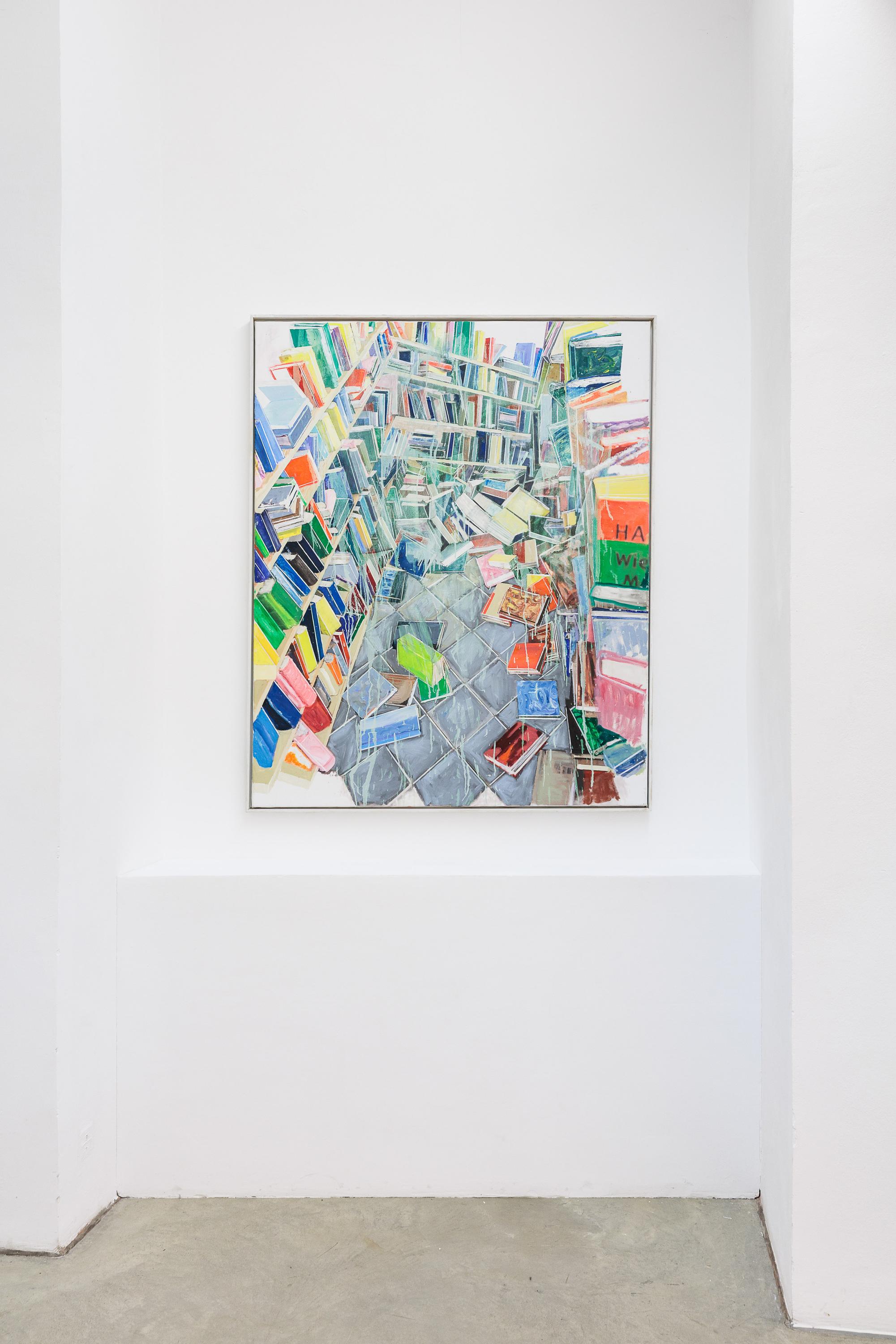 Thomas HARTMANN’s paintings revolve around books and archives. A “zoo of literacy.” A hymn to the transmission of narratives, reports, and texts. The colours he uses, the blurring effects, the painterly means themselves surpass the books as they are actually stored in libraries and repositories.
