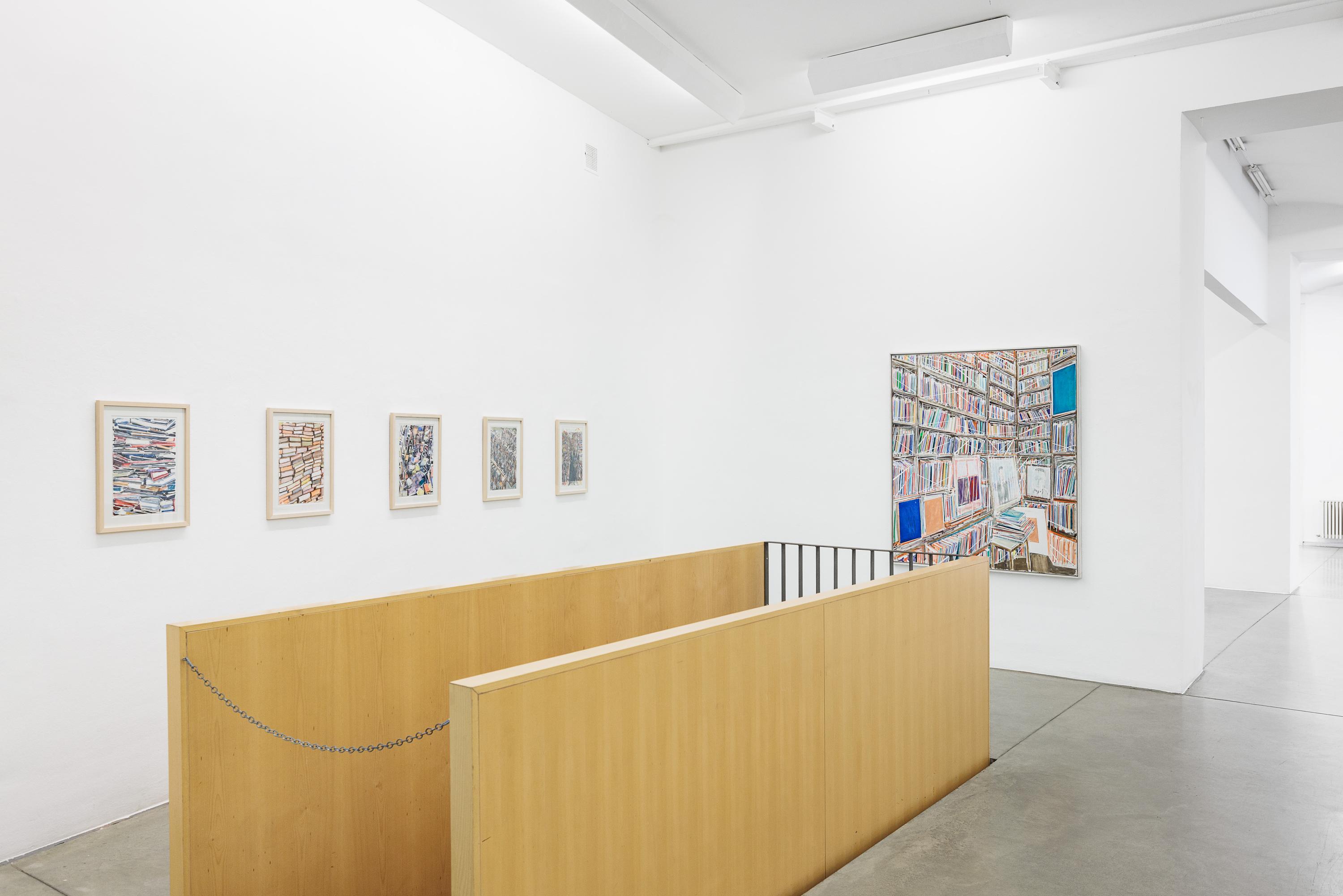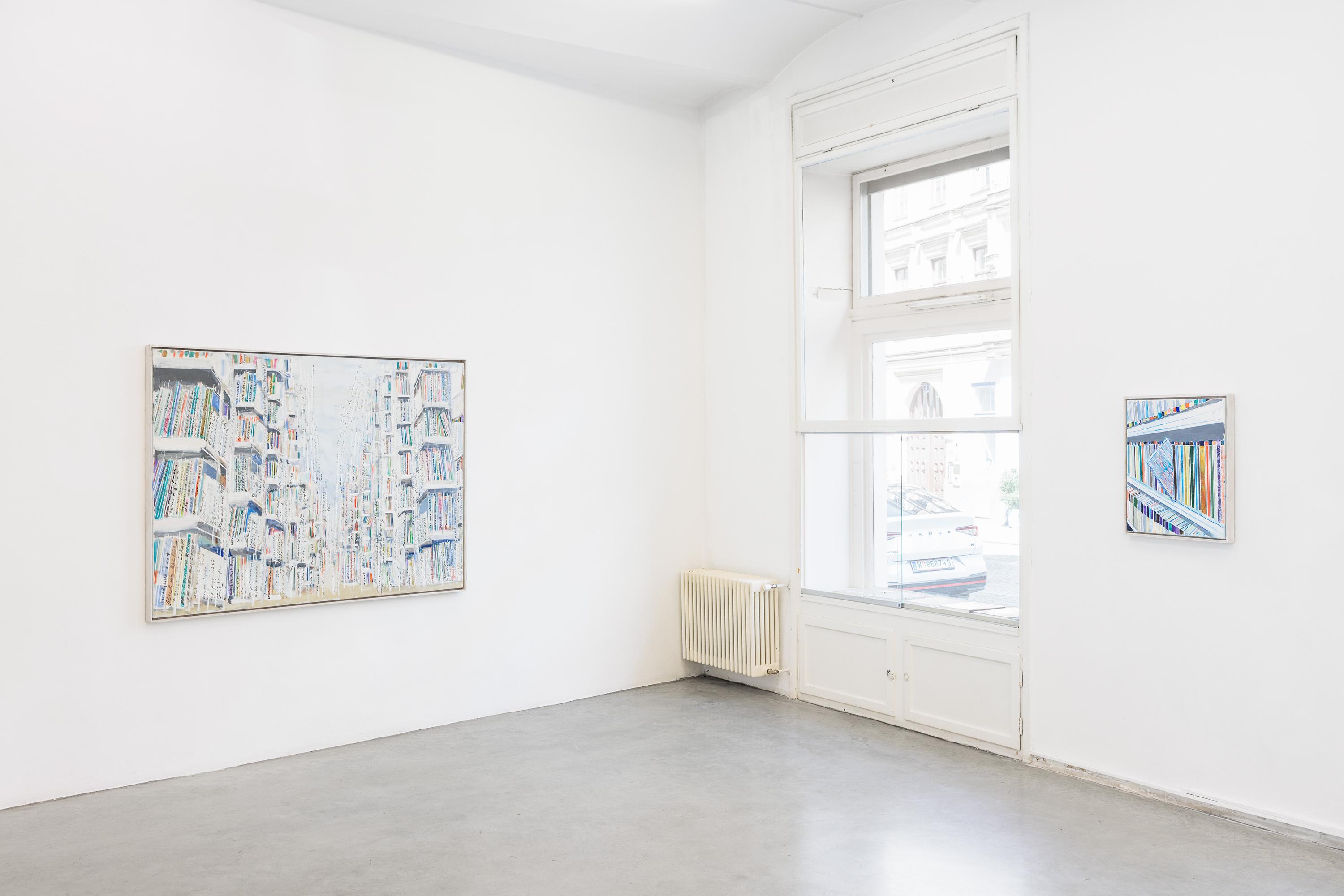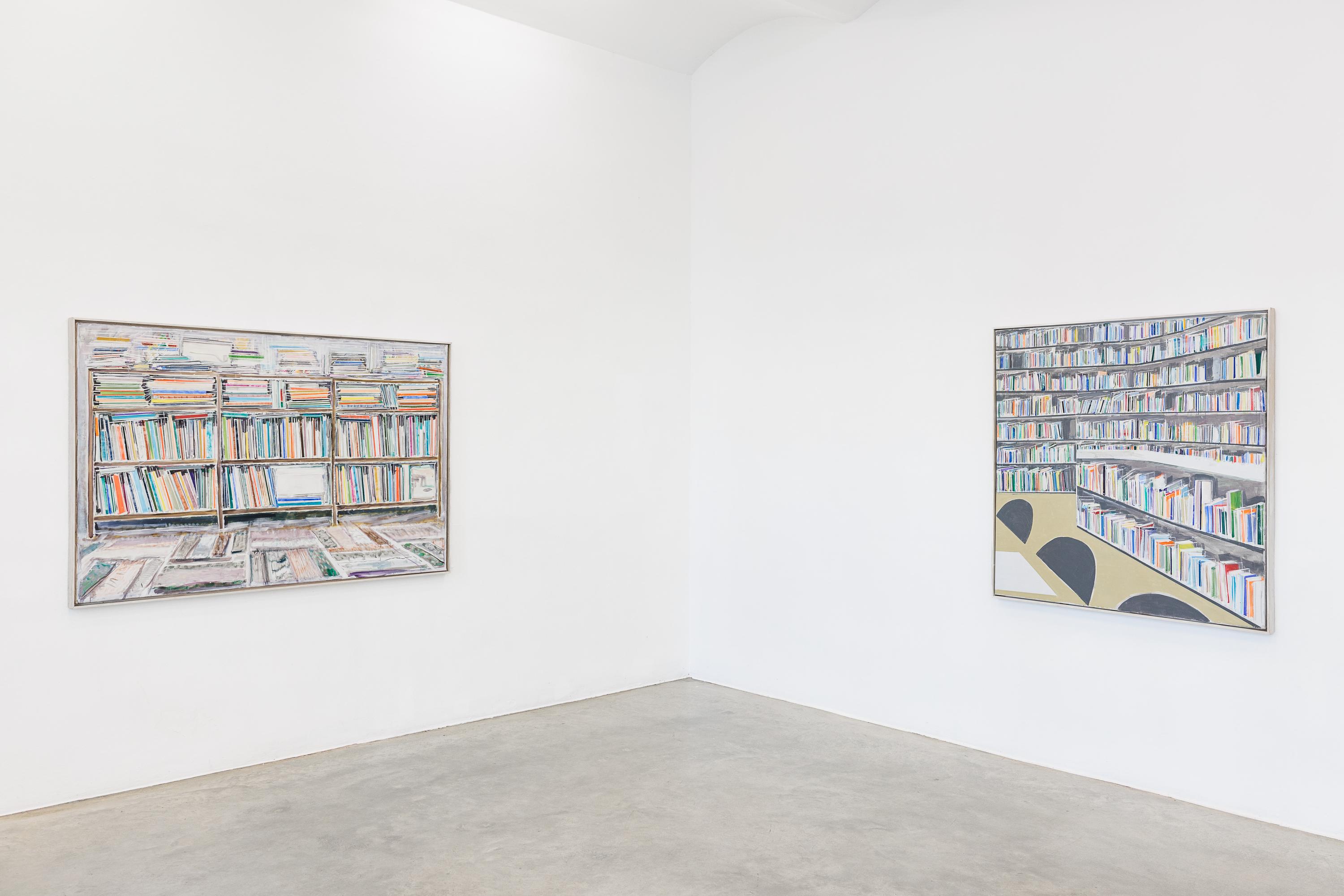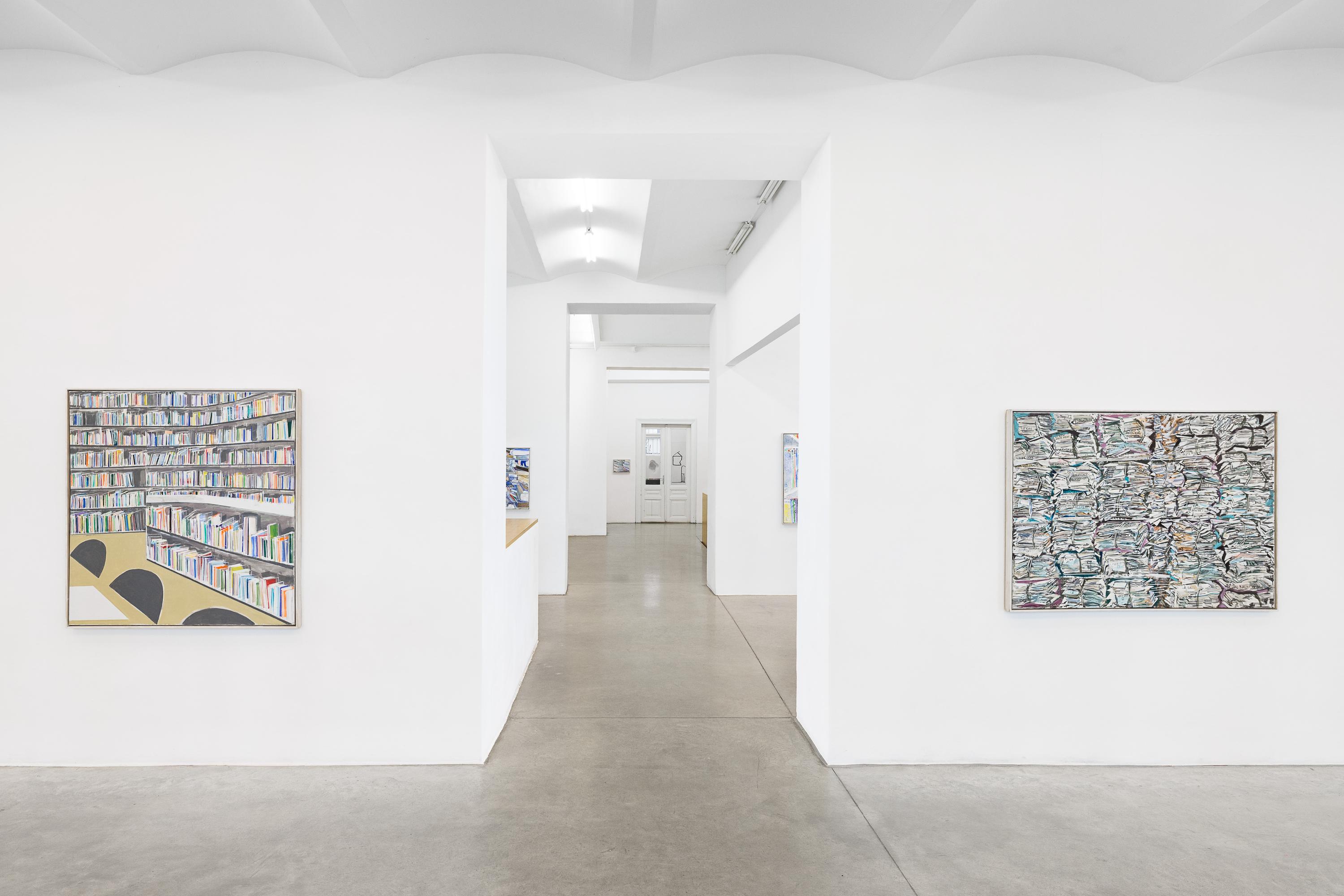 Thomas HARTMANN’s paintings revolve around books and archives. A “zoo of literacy.” A hymn to the transmission of narratives, reports, and texts. The colours he uses, the blurring effects, the painterly means themselves surpass the books as they are actually stored in libraries and repositories.